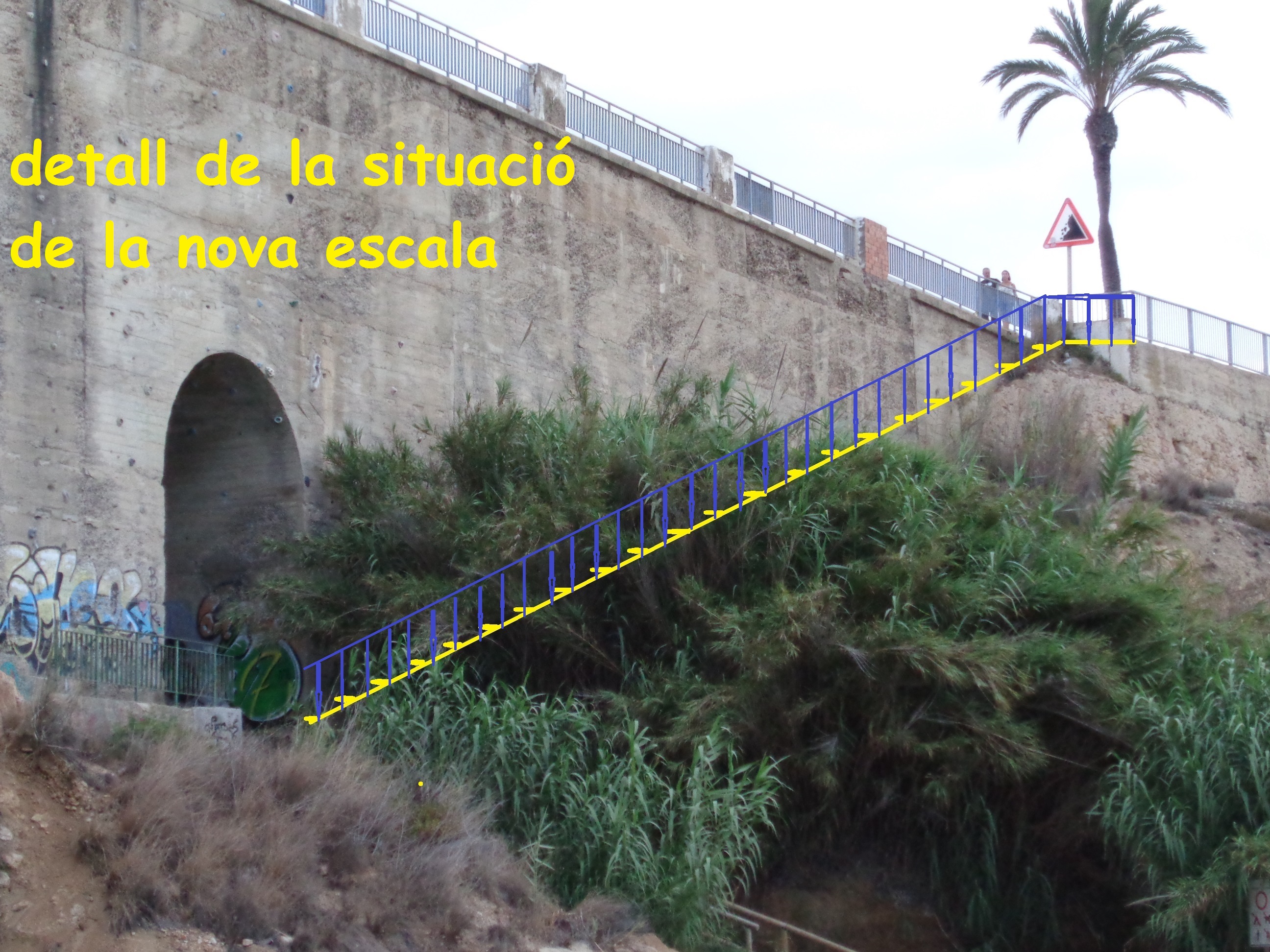 L’escala connectaria el final del passeig amb la cala Rocapins, el Far i les Torretes per sota de la carretera.