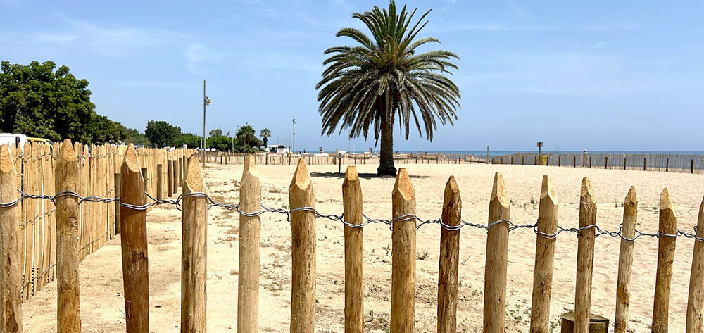 Una palissa d’estaques de castanyer delimita una àrea de 1.910 metres quadrats a l’entorn de la palmera dels antics Banys Suñé, entre la caseta dels pescadors i el Xiri 9. El tancat és ben diferent als que s’han instal·lat a la resta del litoral, tant a la Platja Gran com a la de Garbí, per crear zones protegides on s’hi pugui desenvolupar vegetació pròpia dels medis sorrencs. Es tracta del projecte de naturalització de les platges que s’impulsa amb el finançament europeu dels NEXT GENERATION. Però en aquest punt concret, l’objectiu és diferent. S’hi farà una prova per recuperar una espècie d’herba endèmica de la Mediterrània que està en perill d’extinció.