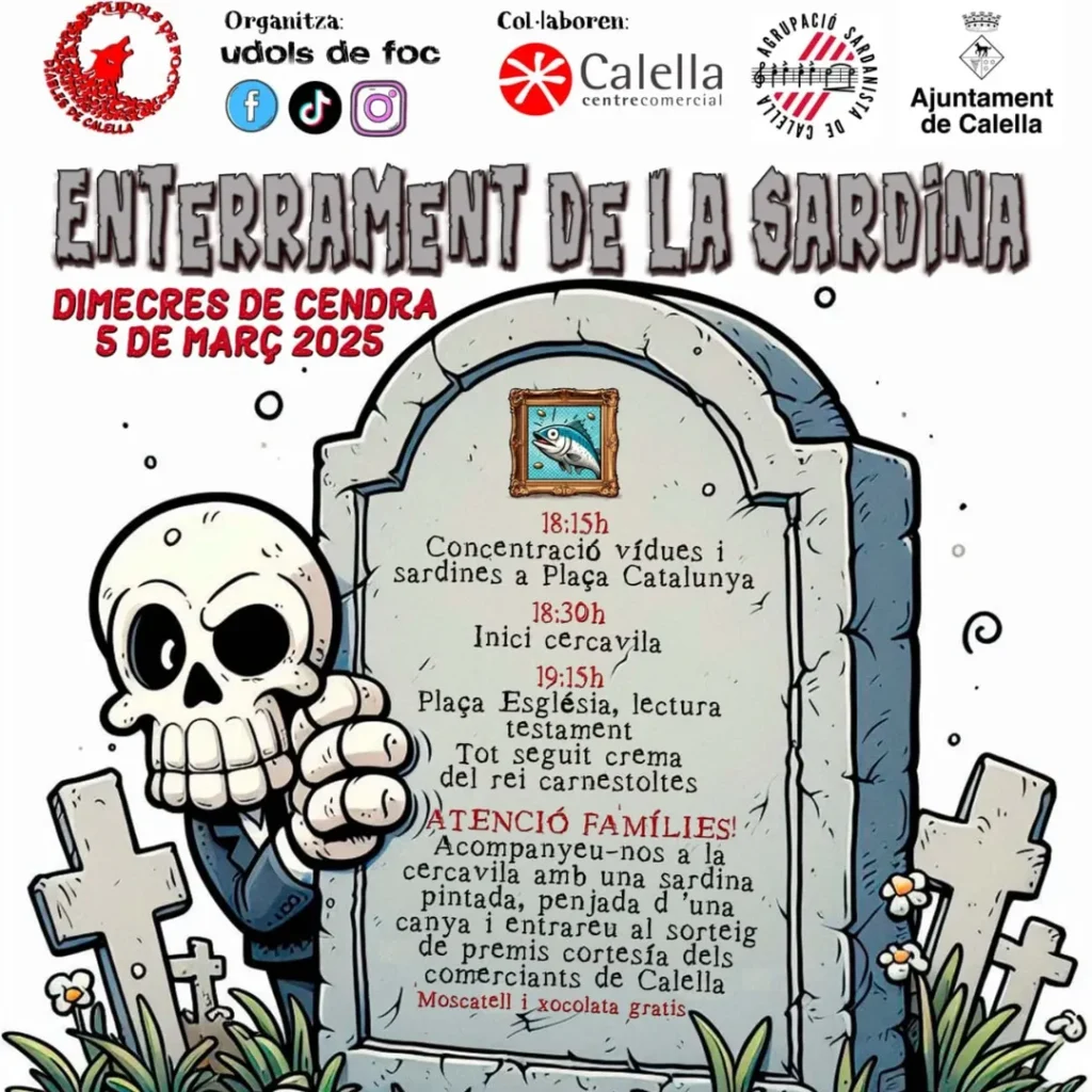 La cercavila de l’enterrament de la sardina es farà per Dimecres de Cendra i, com l’any passat, hi desfilaran els infants amb les seves decoracions i també les vídues, persones disfressades que acompanyaran el rei Carnestoltes en el dia del seu comiat. A la plaça Catalunya es farà la concentració (18.15h) i l’arribada, a la Plaça de l’Església (19.15h), on hi haurà sorteig de premis entre els participants. Seguirà la lectura del manifest i la crema d’en sardineta.