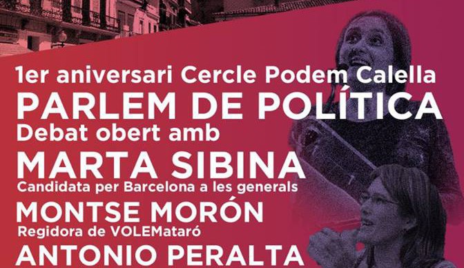Debat polític i amb presència d’una de les candidates a les eleccions generals del 20 de desembre per celebrar que ara fa un any es va constituir oficialment a la ciutat el cercle Podem Calella. Es farà demà dissabte a la sala d’actes de l’Ajuntament Vell (18.30h) i hi intervindrà Marta Sibina, la número 2 de En Comú Podem, la candidatura que aglutina Podem, Barcelona en Comú, ICV i EUiA. Compartirà taula amb la regidora de VOLEMataró, Montse Morón, i el secretari general de Podem Calella, Antonio Peralta.