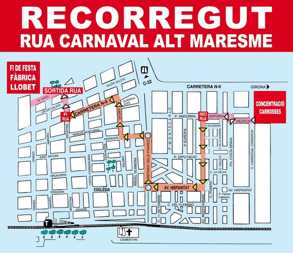 La rua del Carnaval de l’Alt Maresme arrencarà a l’avinguda Mediterrani i continuarà per l’avinguda Hispanitat, recorrent els principals carrers del barri de Poblenou de Pineda de Mar. Ja a Calella, entrarà pel Rierany dels Frares, carrer Moragas i Balmes, per enfilar la carretera N-II, que es tallarà al trànsit.