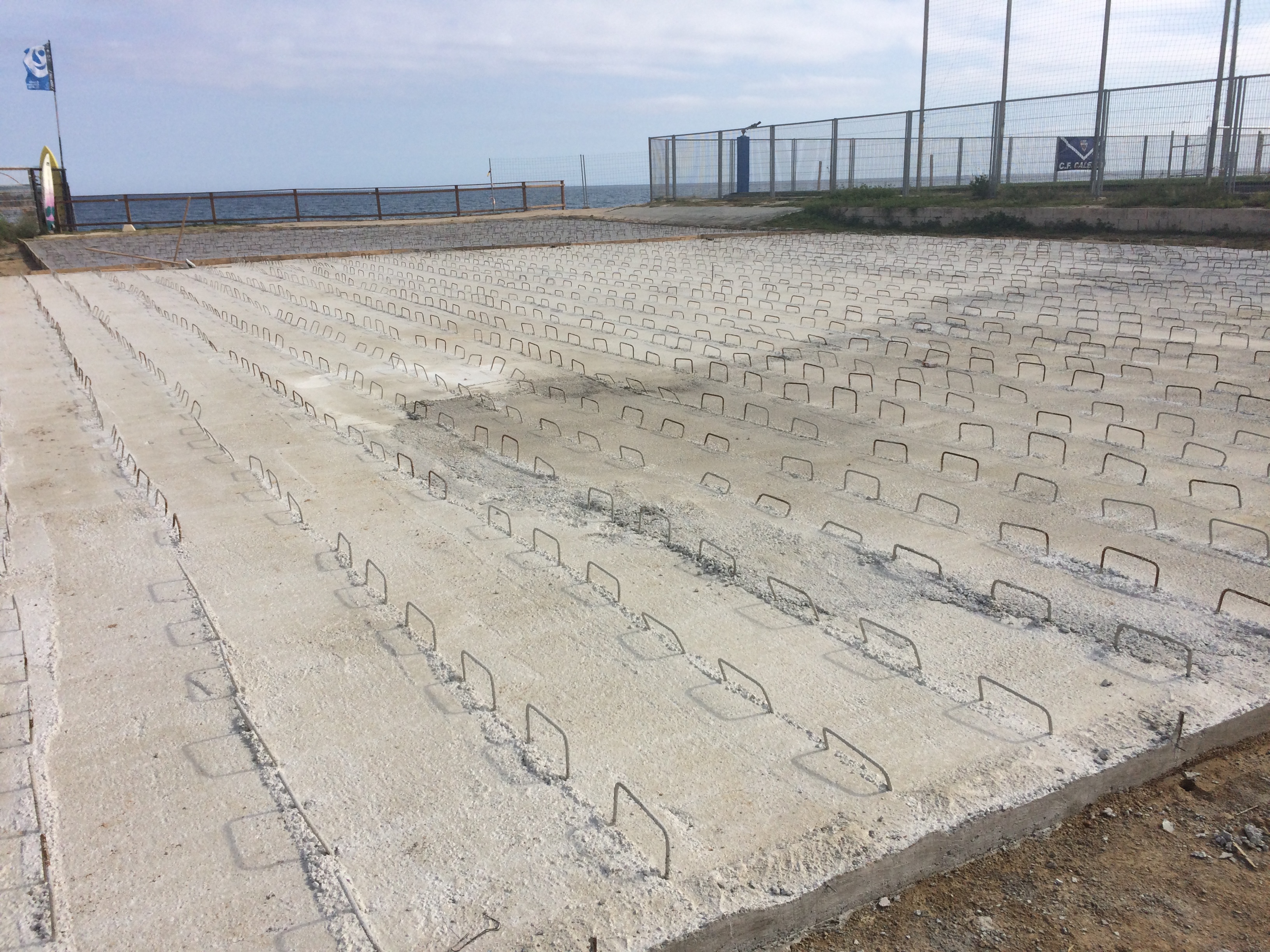 Avança el procés de construcció de les noves guinguetes de platja de Calella. Uns treballs que són visibles aquests dies per als qui passegen pel camí de platja. La base de formigó s’està preparant a l’espai obert que hi ha al costat del Camp de Futbol de Mar, on s’està assecant el material. Aquest procés pot durar entre 10 i 20 dies.