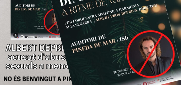El concert del Cor i Orquestra Harmonia Alta Segarra, previst per aquest diumenge a l’Auditori de Pineda de Mar, ha generat una forta polèmica i el rebuig de la Comunitat Feminista de Calella. El motiu és que l’orquestra està dirigida pel músic pinedenc Albert Deprius, que té causes judicials pendents de resoldre per delictes d’agressió sexual a exalumnes seves, quan tenia el centre a Can Salom, a Calella.