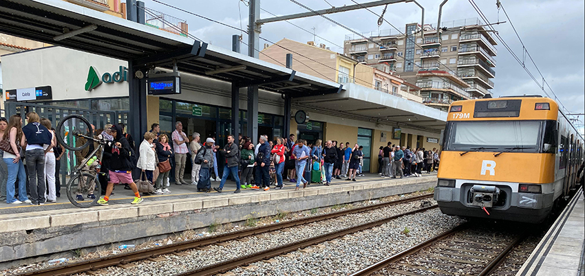 Usuaris de Rodalies s’acumulen a l’andana de l’estació de Calella per les afectacions que s’estan registrant des de primera hora del matí com a conseqüència d’una incidència tècnica que la companyia notificava a través de les xarxes socials.