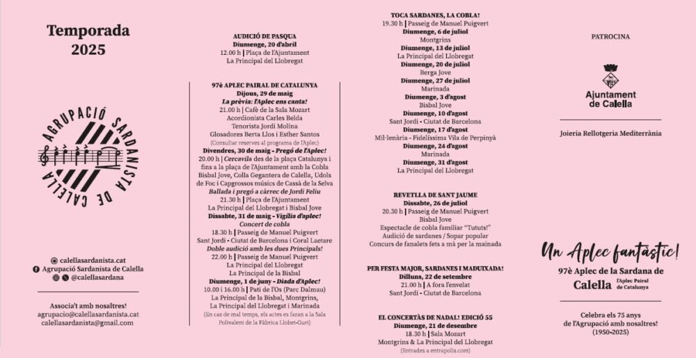 Aquesta és la principal novetat de la programació de la temporada sardanista 2025 que s’ha presentat aquest cap de setmana a l’Auditori Josep Maria Terricabras. S’obrirà amb una audició de Pasqua a la Plaça de l’Ajuntament, el diumenge 20 d’abril, amb La Principal del Llobregat. Tampoc hi faltarà l’audició del cicle d’estiu al Passeig Manuel Puigvert, cada diumenge del 6 de juliol al 31 d’agost; i la renovada revetlla de Sant Jaume, el dissabte 26 de juliol, amb espectacle infantil, el concurs de fanalets artístics, l’audició amb la Bisbal Jove i el sopar popular. O el Concertàs de Nadal: edició 55 a la Sala Mozart, el diumenge 21 de desembre, amb la participació de les cobles Montgrins i La Principal del Llobregat.