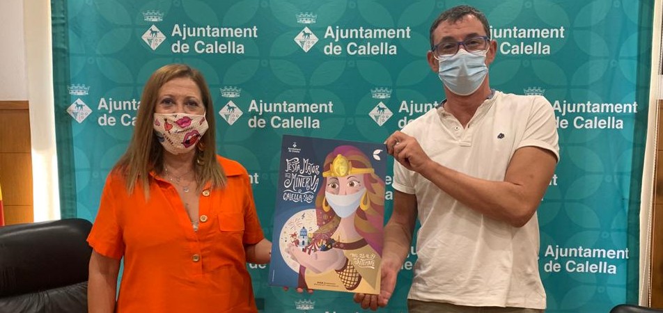 L’alcaldessa i el promotor Marcel Pla mostrant el cartell de la Festa Major del 2020, obra del calellenc Sergi Cugat