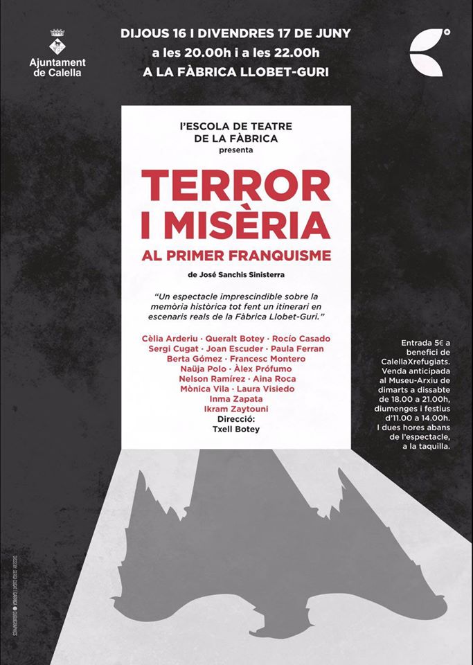 Demà dijous i el divendres, dins els actes de Festa Major de Sant Quirze i Santa Julita, l’Escola de Teatre La Fàbrica munta un espectacle en favor de Calella pels Refugiats. Interpreten «Terror i misèria en el primer franquisme», amb text de José Sanchis Sinisterra, que també és autor de la cèlebre «Ai Carmela».