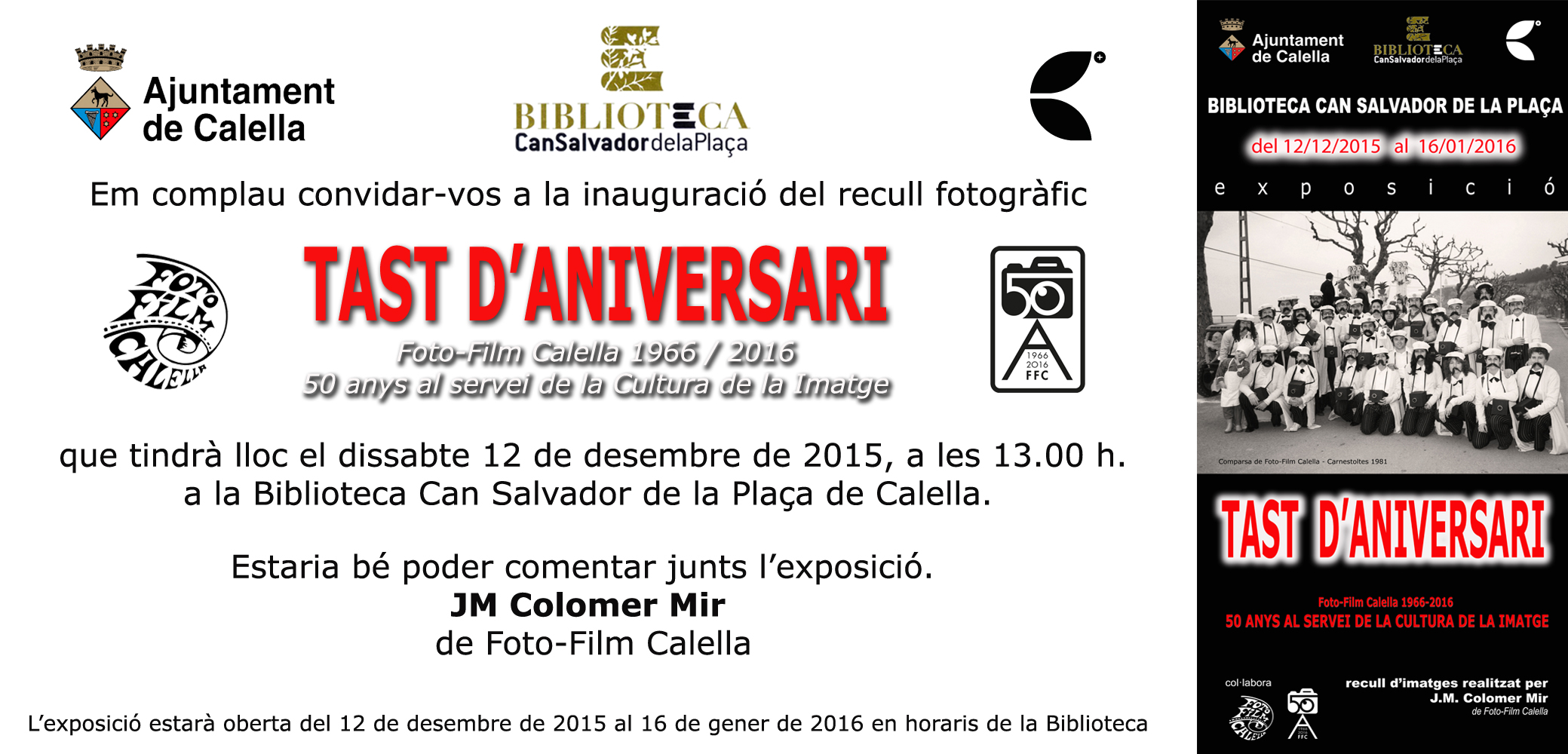 Tast d’aniversari. Aquest és el títol d’un recull de fotografies que a partir d’aquest dissabte es podran veure a la biblioteca Can Salvador de la Plaça. Es tracta d’una mostra fotogràfica organitzada per Foto Film Calella i que és el tret de sortida als actes per celebrar, durant el 2016, els seus 50 anys d’existència.