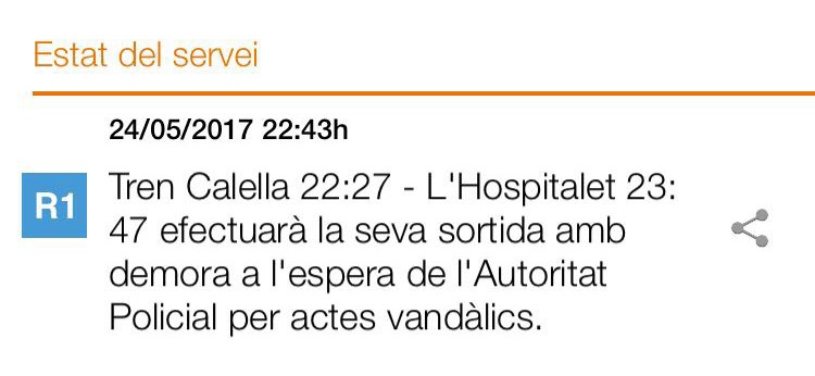 Segons ha explicat un portaveu de Renfe, un grup de sis joves es trobaven al tren que havia de sortir de Calella a les 22:27 i ho feien fumant dins el vagó i provocant molèsties a la resta de viatgers. Després de fer cas omís a les indicacions de l’equip de seguretat de l’estació, es va requerir la presència dels Mossos d’Esquadra. Tot plegat va provocar una aturada de 20 minuts.