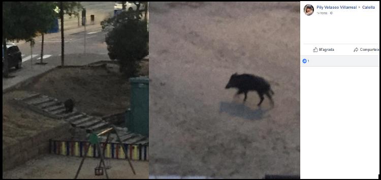 No és el primer cop que els animals s’apropen a zones habitades de Calella. Una usuària del grup de Calella al Facebook ha compartit en les últimes hores unes fotografies captades de nit en què es veu l’animal a l’àrea de jocs infantils de la plaça que hi ha a l’entrada lateral de la Fàbrica Llobet-Guri.