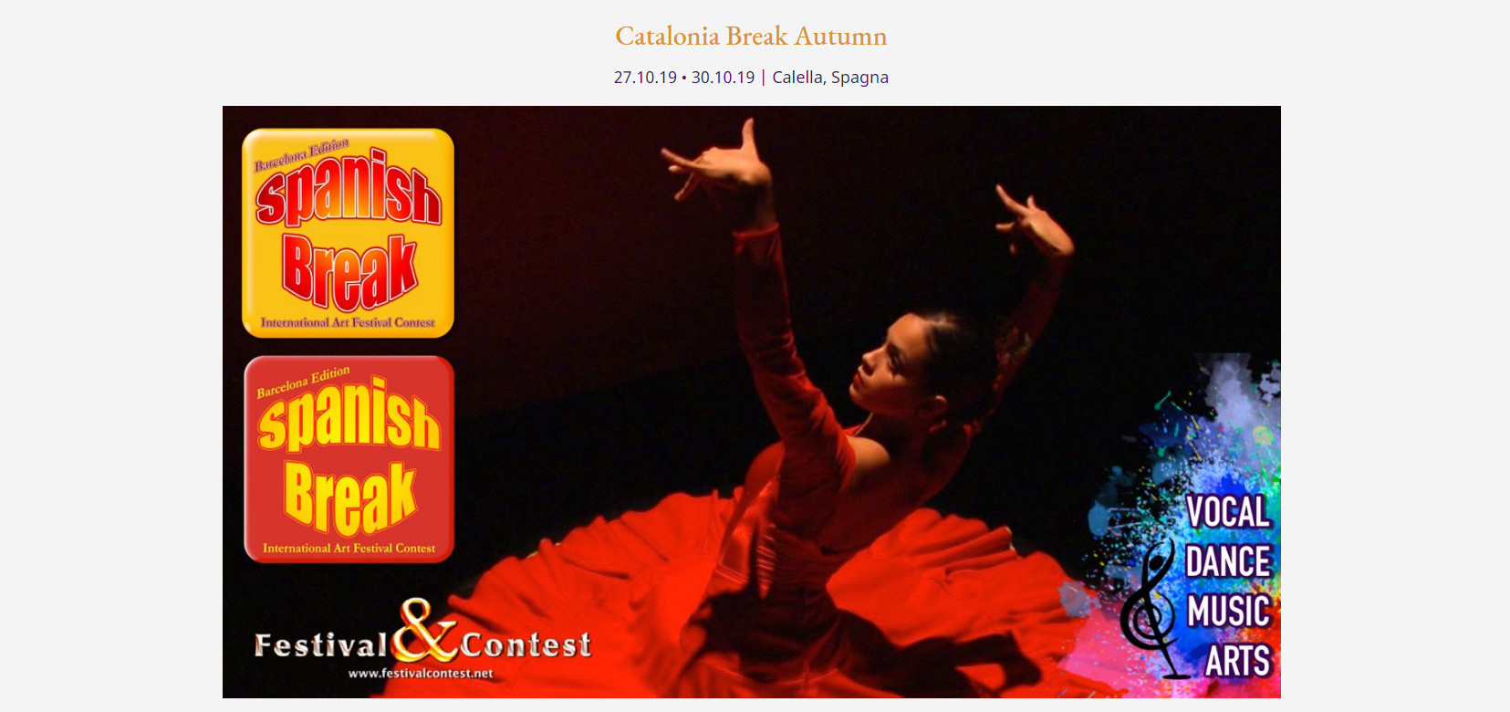 El Festival Internacional Catalonian Break s’estrenarà el 2019 a Calella com un nou element de l’oferta turística cultural de la destinació. El certamen inclourà concerts i actuacions de dansa a la Sala Mozart, i es preveu portar algunes demostracions al carrer, a l’aire lliure. L’acord al qual ha arribat l’Ajuntament de Calella i l’empresa Festival&Contest és per al 2019 i amb dues dates, a la primavera i a la tardor.