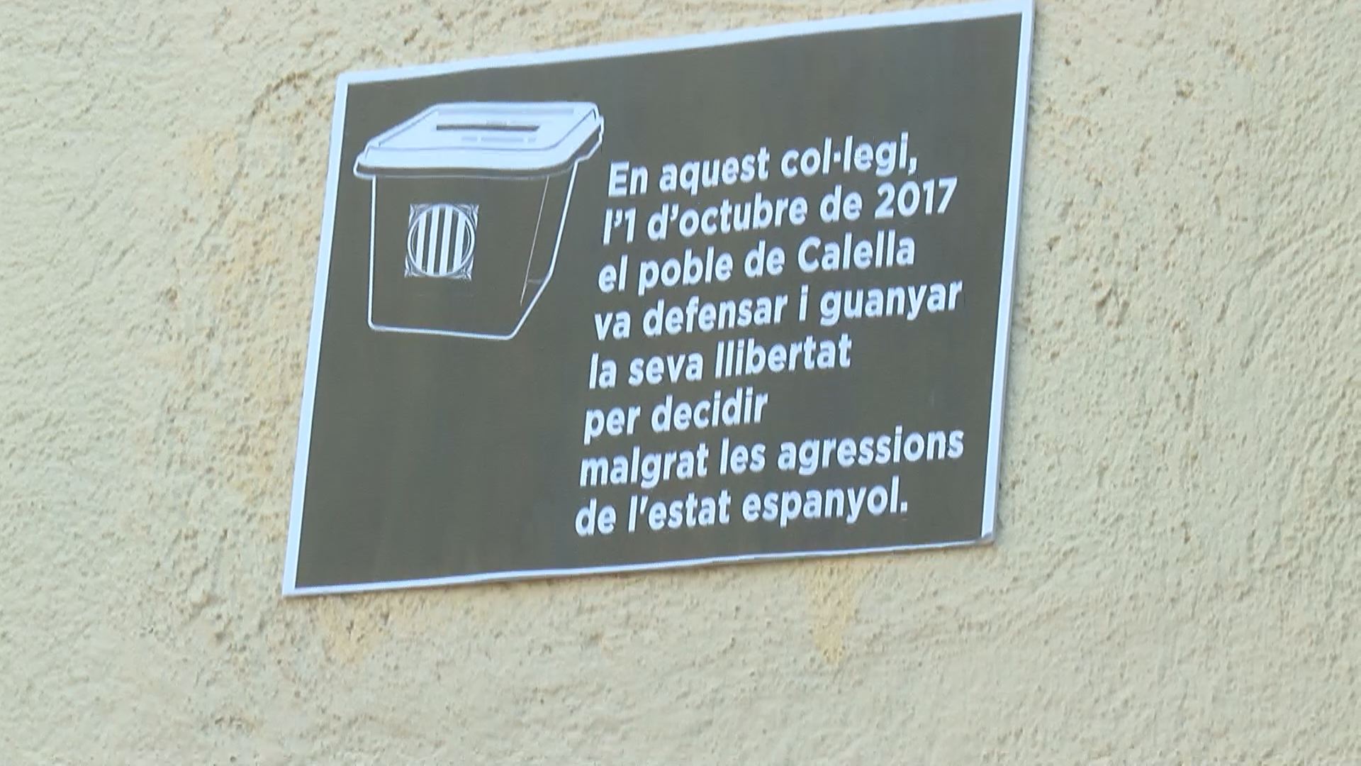 Plaques amb el missatge “En aquest col·legi, l’1 d’octubre de 2017 el poble de Calella va defensar i guanyar la seva llibertat per decidir malgrat les agressions de l’estat espanyol” han estat col·locades a les façanes dels tres col·legis electorals que van ser oberts per les votacions del referèndum de l’1 d’octubre de l’any passat.