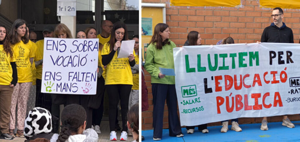 El col·lectiu denuncia la degradació de l’escola pública i torna a reclamar millores salarials i una reducció de la sobrecàrrega de treball, amb més recursos humans i especialitzats per atendre l’alumnat complex, abaixant ràtios i reduint la burocràcia. Aquest matí, mestres i professors d’El Far i La Minerva s’han concentrat a les portes dels centres per llegir un manifest amb el detall de les seves demandes, que ha rebut els aplaudiments de les famílies.